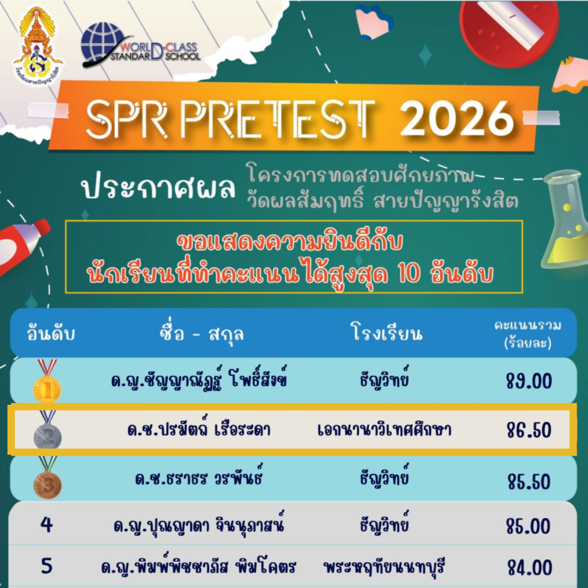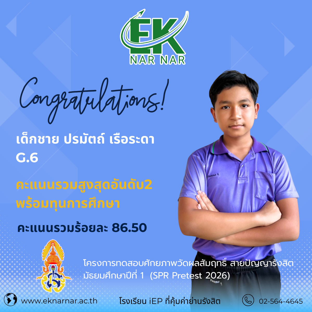 โรงเรียนเอกนานา วิเทศศึกษา ขอแสดงความชื่นชมและยินดีกับนักเรียนที่สร้างความภาคภูมิใจให้กับโรงเรียน ✨ ขอแสดงความยินดีกับ เด็กชายปรมัตถ์ เรือระดา นักเรียนระดับชั้น G.6 ที่ได้รับ คะแนนรวมสูงสุดอันดับที่ 2 พร้อมได้รับ ทุนการศึกษา จากโครงการทดสอบศักยภาพวัดผลสัมฤทธิ์ สายปัญญารังสิต มัธยมศึกษาปีที่ 1 (SPR Pretest 2026)